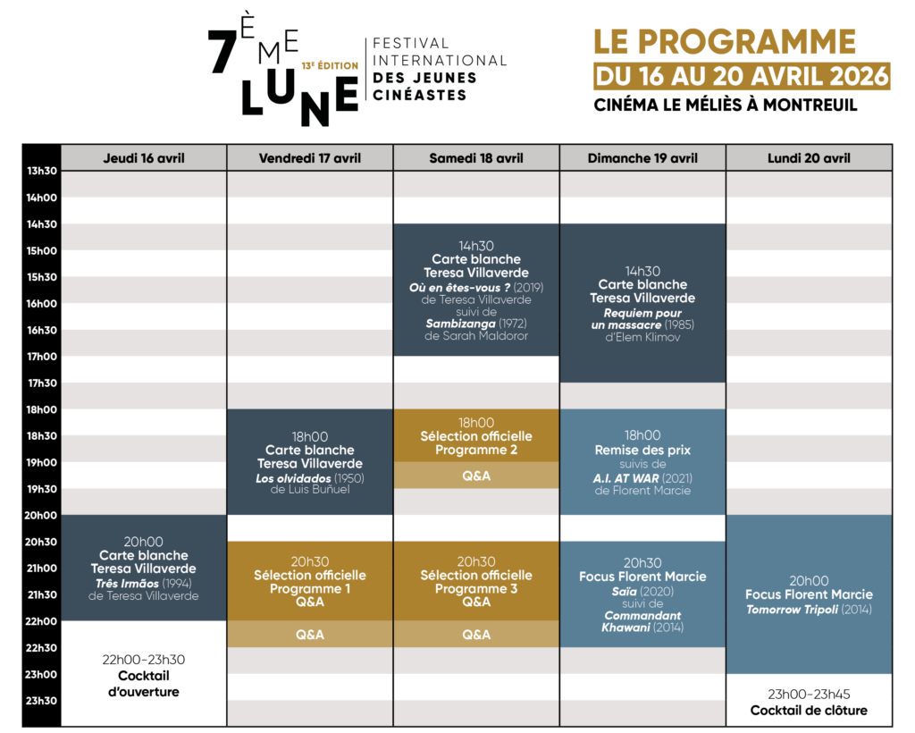 Découvrez le programme de la 13e édition de 7ème Lune, Festival International des jeunes cinéastes, qui se déroulera du 16 au 20 avril prochain au Cinéma Le Méliès à Montreuil.Téléchargez l’agenda en cliquant ici